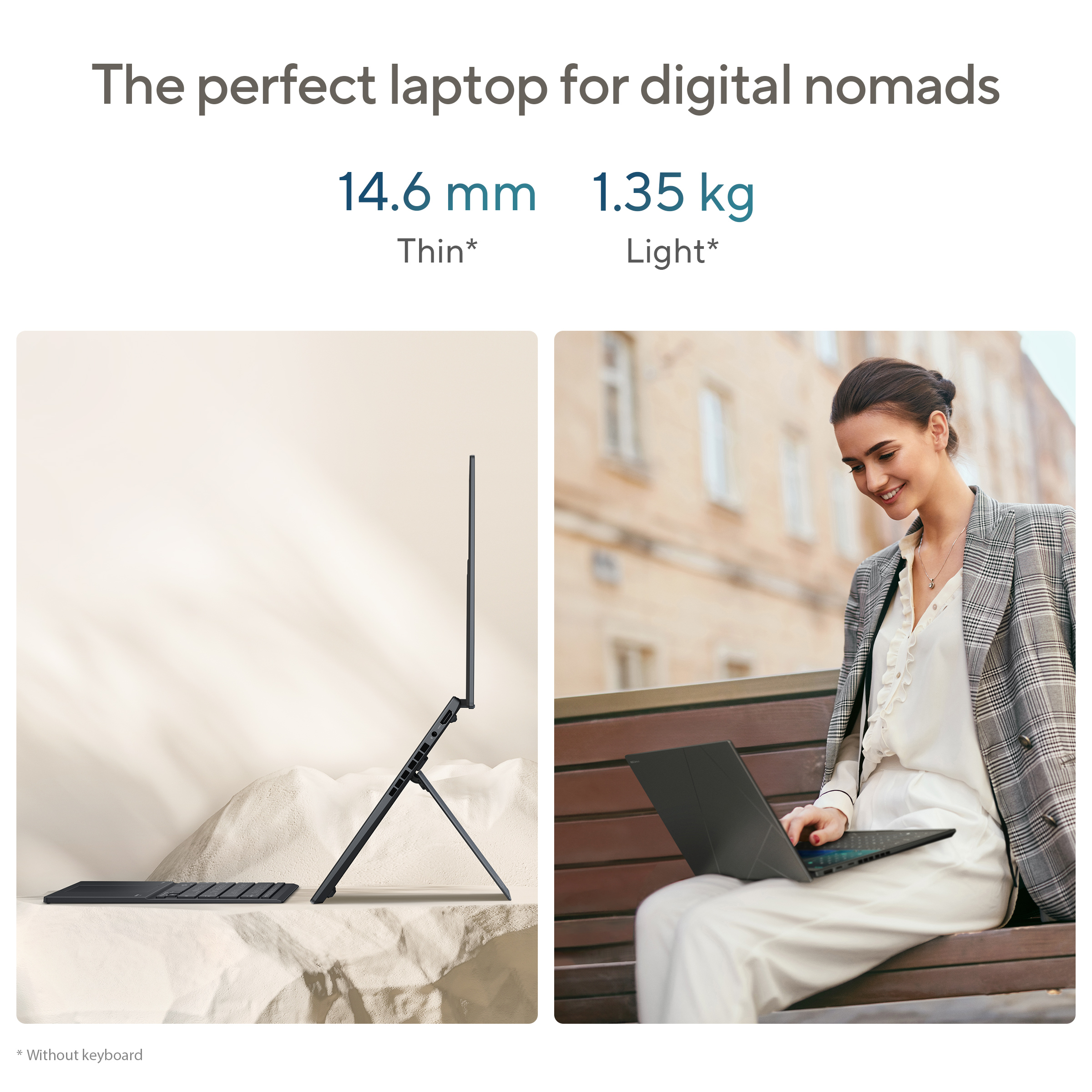 ASUS Zenbook DUO is a revolutionary dual-screen laptop, with two full-size OLED touchscreens1, detachable full-size keyboard and built-in kickstand, — expertly combining multitasking versatility with superb mobility.